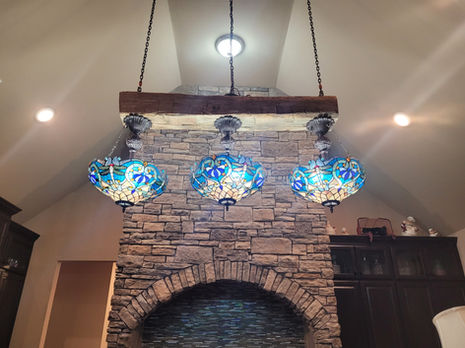 With Faux beams, porcelain tile that looks like slate, knotty alder beams, seedy glass in the cabinets, farmhouse sink with under counter lights.